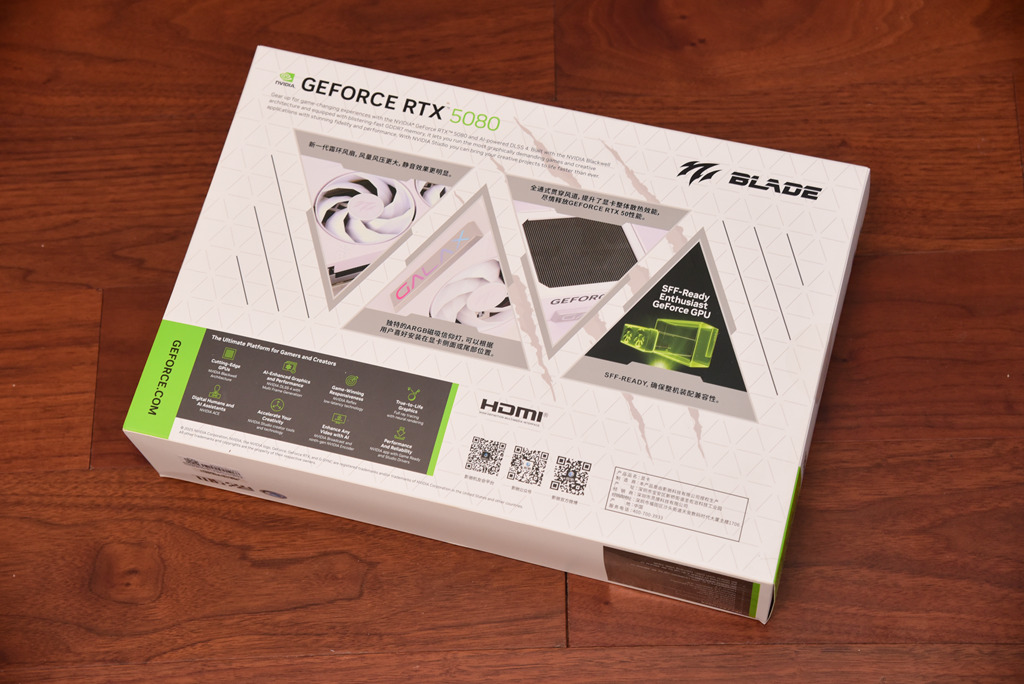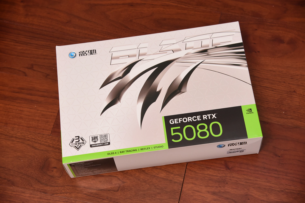 测试使用了影驰的RTX5080圣刃显卡,圣刃主打白色装机风格。圣刃的包装盒非常有个性,LOGO就像一只锋利的爪子,浓浓的金属质感风格的专属LOGO让人眼前一亮。