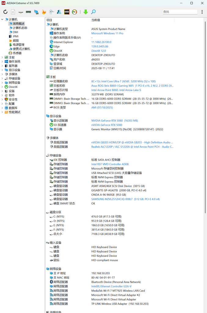 ROG STRIX B860-I GAMING WIFI主板,搭配的是新一代200S系列酷睿处理器。经历了14代酷睿的各种不给力之后,新一代200S酷睿处理器刚上市的表现也不太理想,后期随着优化和完善才慢慢达到了理想的表现,也是可以放心选择的。