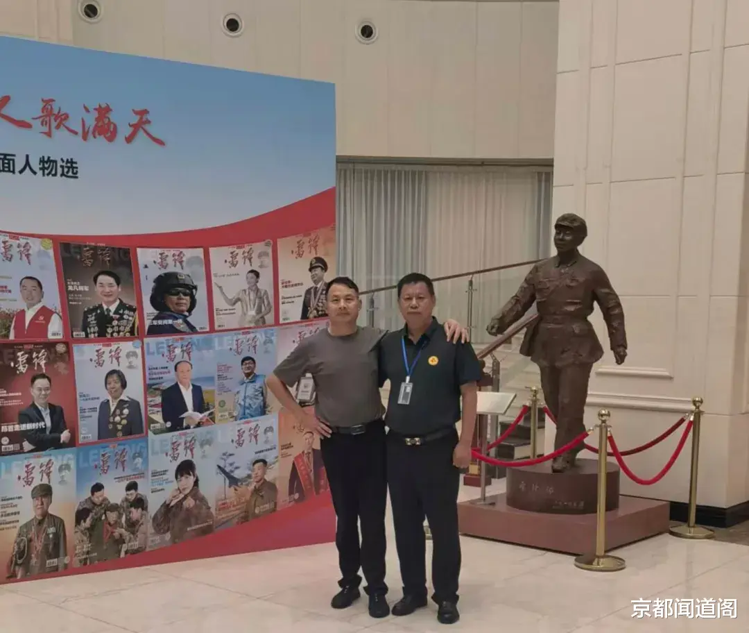 正准备返程时,迎面跑来一位军人气质满满的同龄人。偶遇了曾被作为《雷锋》杂志封面人物重点报道的自主择业军官金正洪,这是自己没有想到的。因为刊登他的那期杂志自己做了收藏格外记忆犹新,再加上综合楼大堂最显眼处《雷锋》杂志封面人物宣传墙也有图片。同为退役军人,我们俩一见如故,相见恨晚。不仅彼此添加微信好友,还来到了一楼大厅,在中央美术馆馆长吴为山创作的心里有爱脚下生风的雷锋铜像前留下合影留念。