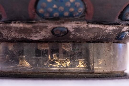 尤其是口沿和圈足上的水晶,是透明的,透过它,还能看到里面的金色凤鸟(图5),充分利用了水晶的特性,我差点当成是文物出土后加的保护材料。