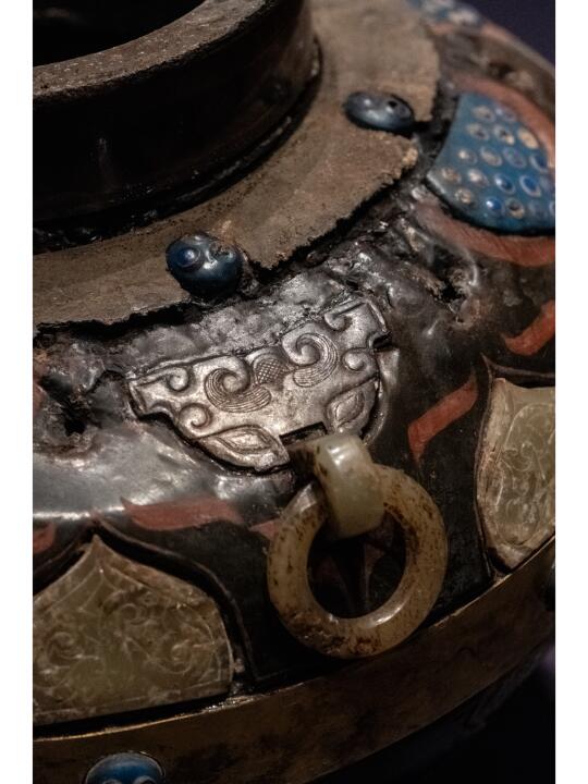出土自巢湖北头山一号汉墓,一件壶上用了七种材料,包括木胎,铸铜,水晶,料珠,银,玉,金,基本上把古人常用的材料都用上了,太厉害了简直。