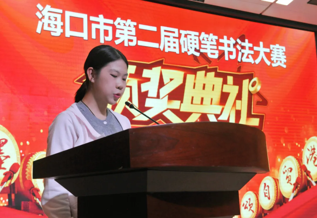 海口市第二届硬笔书法大赛中学组一等奖获得者、海口市灵山中学高一学生陈春潼代表所有获奖学生发言。
