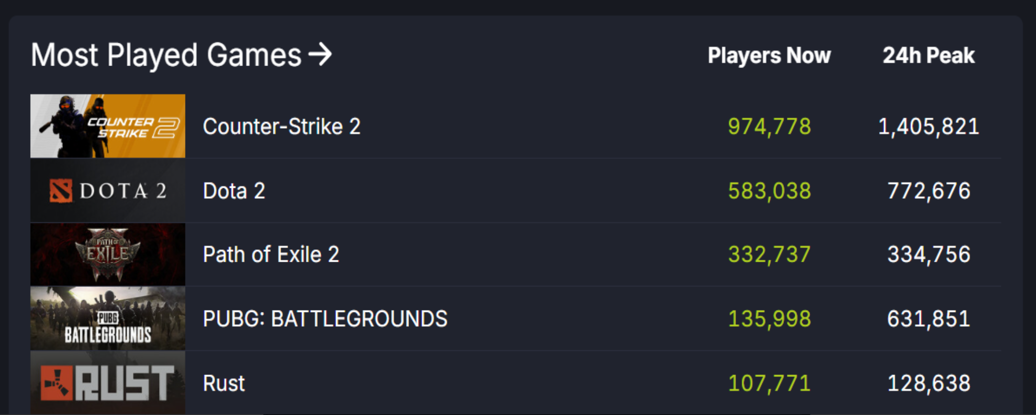 高峰期间,它甚至一度超越《PUBG》,跻身Steam最高在线人数前三。TwitchGame 分类榜单中同时观看人数也以近40W人次获得了第一。