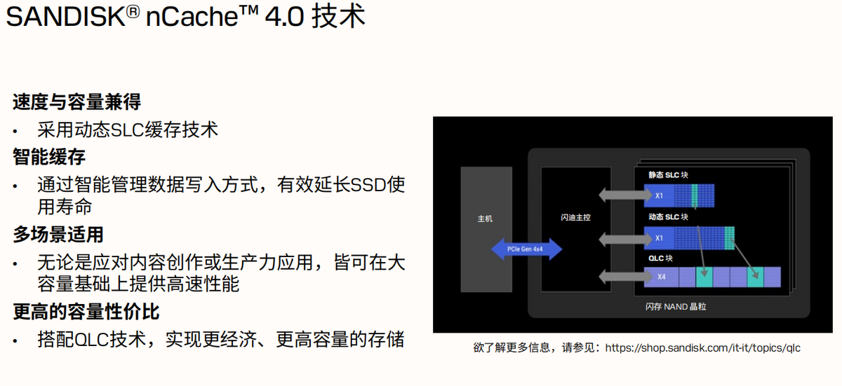 闪迪公司产品市场经理刘小龙解释道:“nCache4.0技术是闪迪众多创新技术之一,目标是保证SLC有足够高寿命情况下,依然能够保持高性能。nCache 4.0技术会将较小的主机写入请求进行聚合,然后以对闪存更友好的方式写入用户空间,从而帮助减少用于用户空间的NAND磨损。这对于主控来讲其实是非常有挑战的,这也是这款nCache4.0技术的亮点。因为减少了终端用户的磨损,同时SLC的P/E cycle(固态存储擦除周期)也比较高,会带来QLC耐久度的提升,比如说我们刚刚看到能达到1200TBW(4TB版本)。因为它使用了动态SLC,所以它的读写速度、突发速度都有很大的改善。”