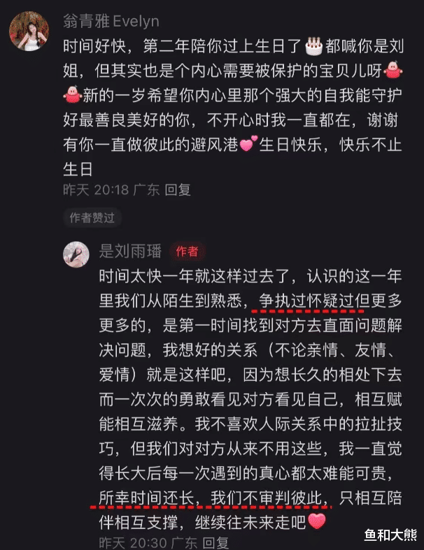 如今一年时间过去,一度消失(不分享个人动态)的翁青雅回归,不仅开始分享自己的日常生活,也开始接广告了,而她和刘雨璠的关系也回暖了,两人生日也有互送礼物,并且一起为对方庆生,看上去关系并未受到之前那场风波的影响。