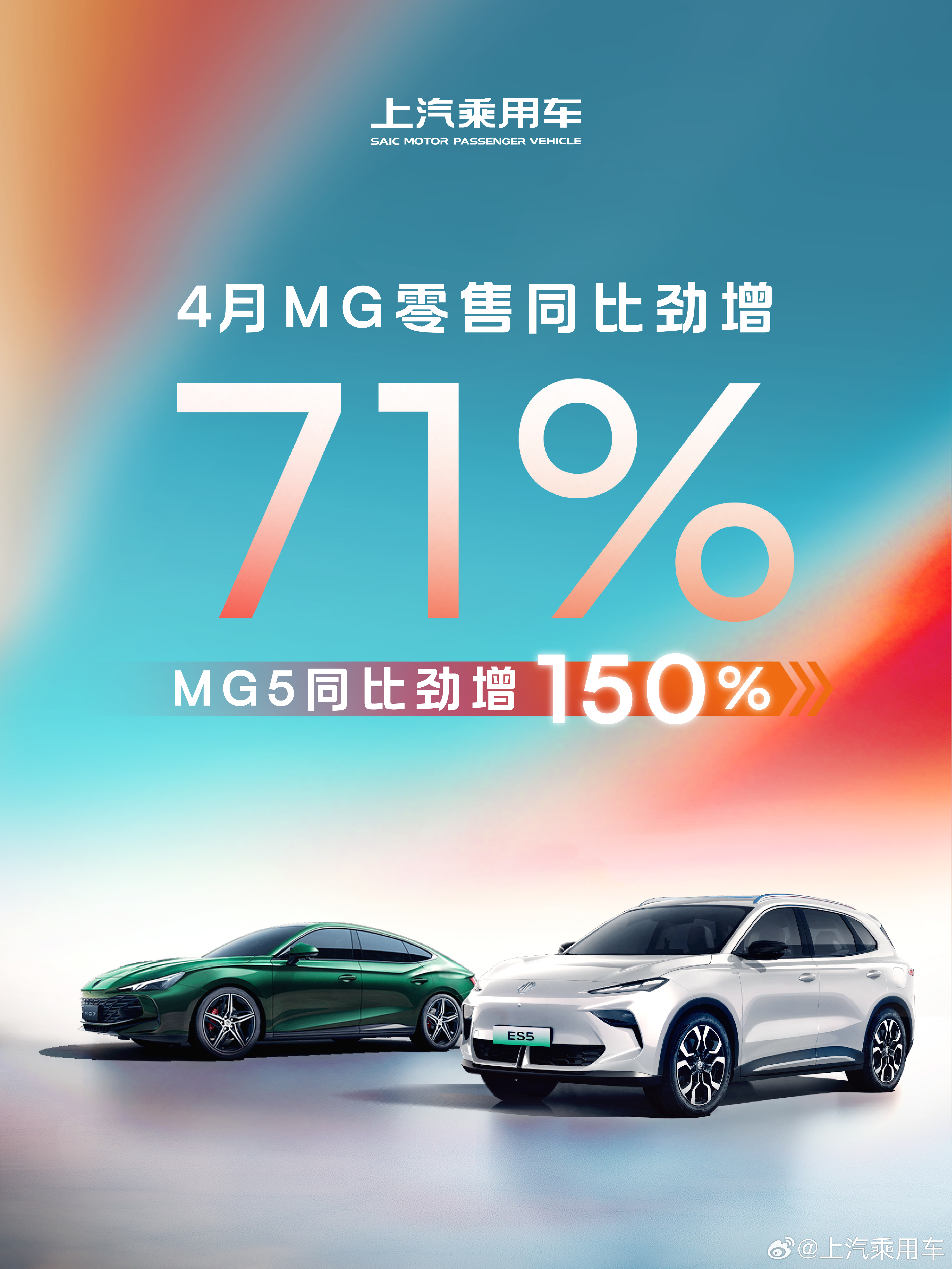 上汽乘用车4月荣威、MG零售67,898辆!荣威、MG同比实现双增长!