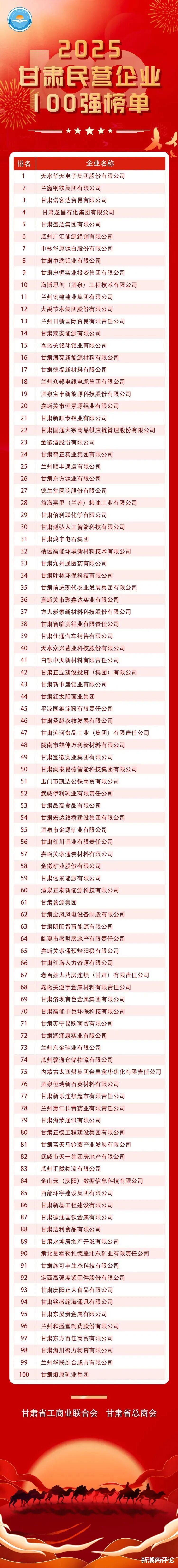 在中国企业联合会、中国企业家协会发布的“2025中国企业500强”中,甘肃有6家企业再次入围,分别是金川集团(4236.94亿元)、甘肃公航旅集团(937.34亿元)、白银集团(867.87亿元)、酒钢集团(783.61亿元)、甘肃建投集团(739.75亿元)、兰州新区商投集团(595.71亿元),分别排在榜单第59、275、293、317、333、418位。