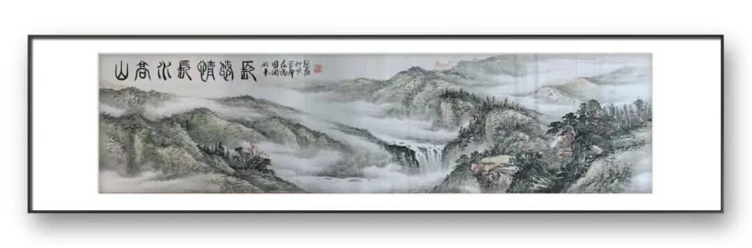 杨顺龙老师的山水之作,尽显天地浩渺与文人情怀。山峦巍峨,云雾缭绕,瀑布飞流直下,山脚下屋舍俨然,营造出静谧祥和的世外桃源之境,仿佛能让人感受到居于此处的悠然与幸福;以阔大的视野描绘出连绵群山与滔滔流水,云雾在山间流转,似将山水的悠长与情意的绵长都融入这无尽的天地之间,笔墨苍润,意境深远,展现出传统山水画“咫尺山林,万里江天”的独特魅力。