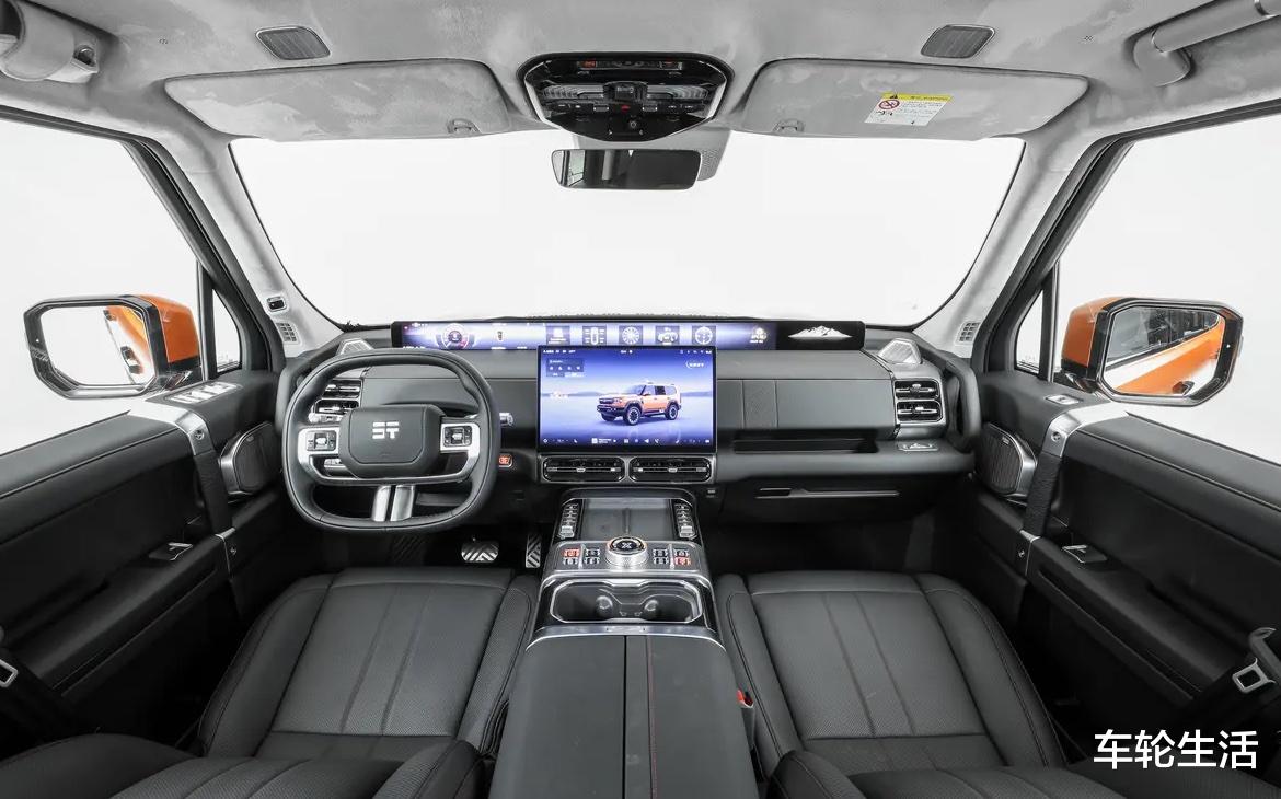 内饰上的话,看起来中规中矩,整体来看在简约的同时,在一些细节上面也保留了硬派风格,比如说厚重的中控台,空调出风口旁边的扶手。另外,换挡杆采用的是怀挡设计,实话讲,虽然怀挡设计越来越流行,但是我觉得其实硬派车型使用传统换挡杆更有感觉,你们觉得呢?对了,在智能驾驶上,这款车有两套系统,中低配会使用猎鹰500辅助驾驶,顶配车型则是华为乾崑智驾,喜欢华为智驾的话,意味着大家要多掏几万块钱去实现,值不值得需要自己考量了。