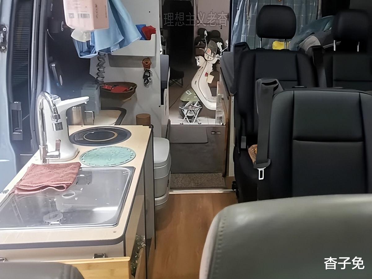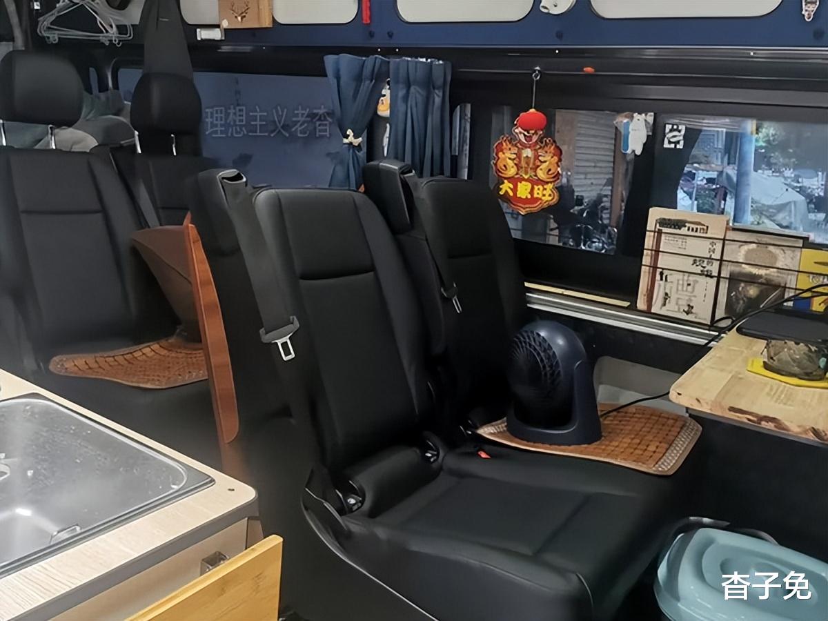 驾驶室简单朴素,中门较宽,一半位置被厨柜占据,中排座椅前添置了一张小桌。