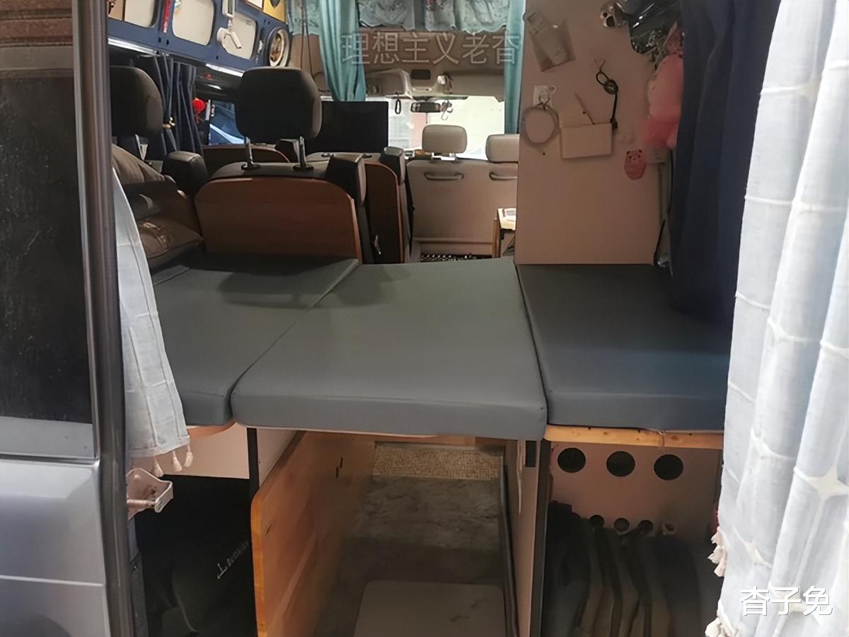 车尾是一张横向双人床,上面有四块软垫拼接,拿出被褥枕头就可躺下休息,床铺下面都是储物仓,合理利用有限的车内空间。