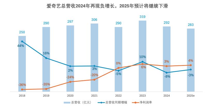 中国在线视频行业正遭遇一场寒意十足的“寒冬”。即便是爱奇艺、芒果tv这样的头部平台,也深陷增长放缓甚至下滑的困局。财报数据显示,曾在2023年迎来营收回暖的爱奇艺,2024年再度掉头向下,营收降至292亿元,2025年预计继续下滑至283亿元左右。