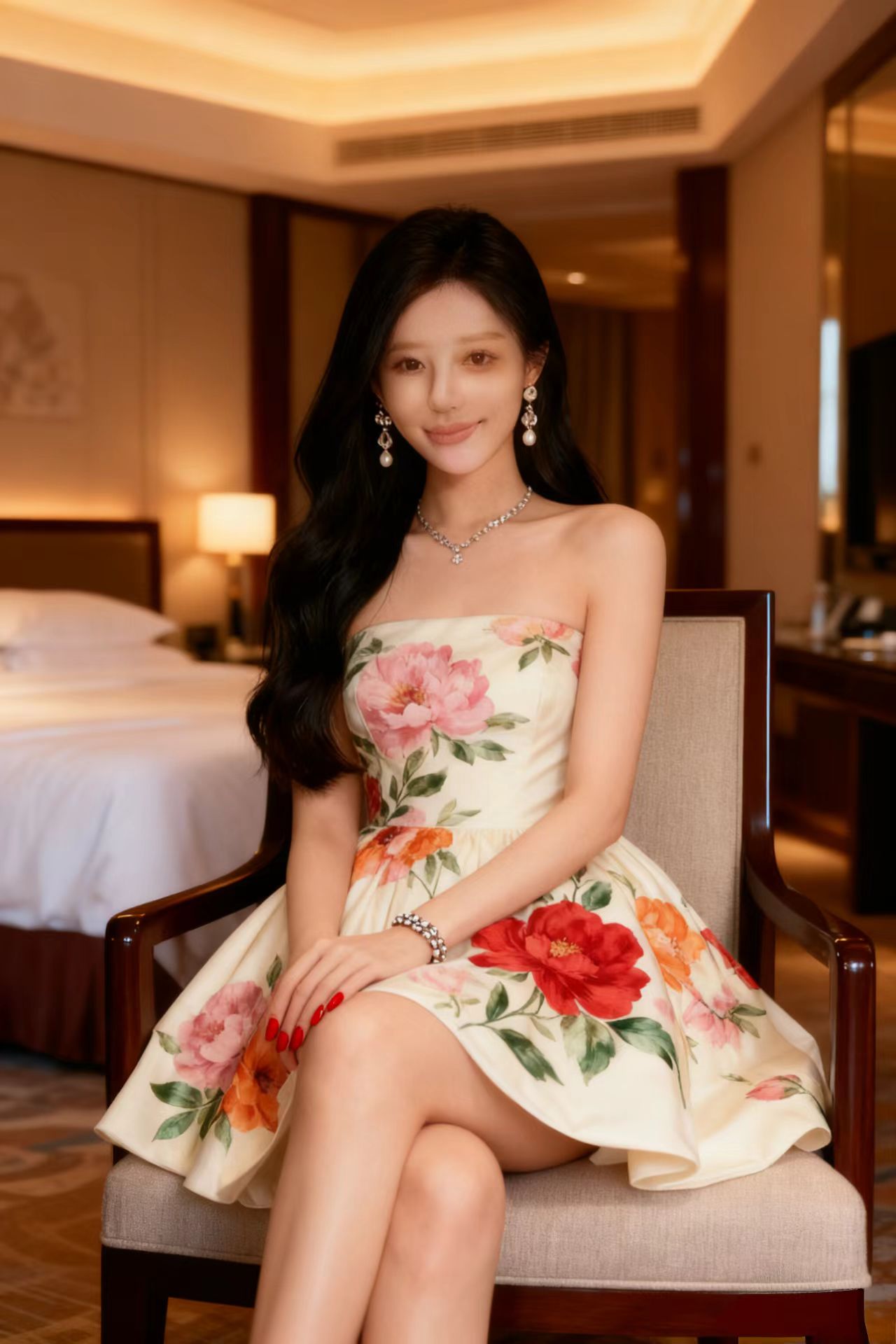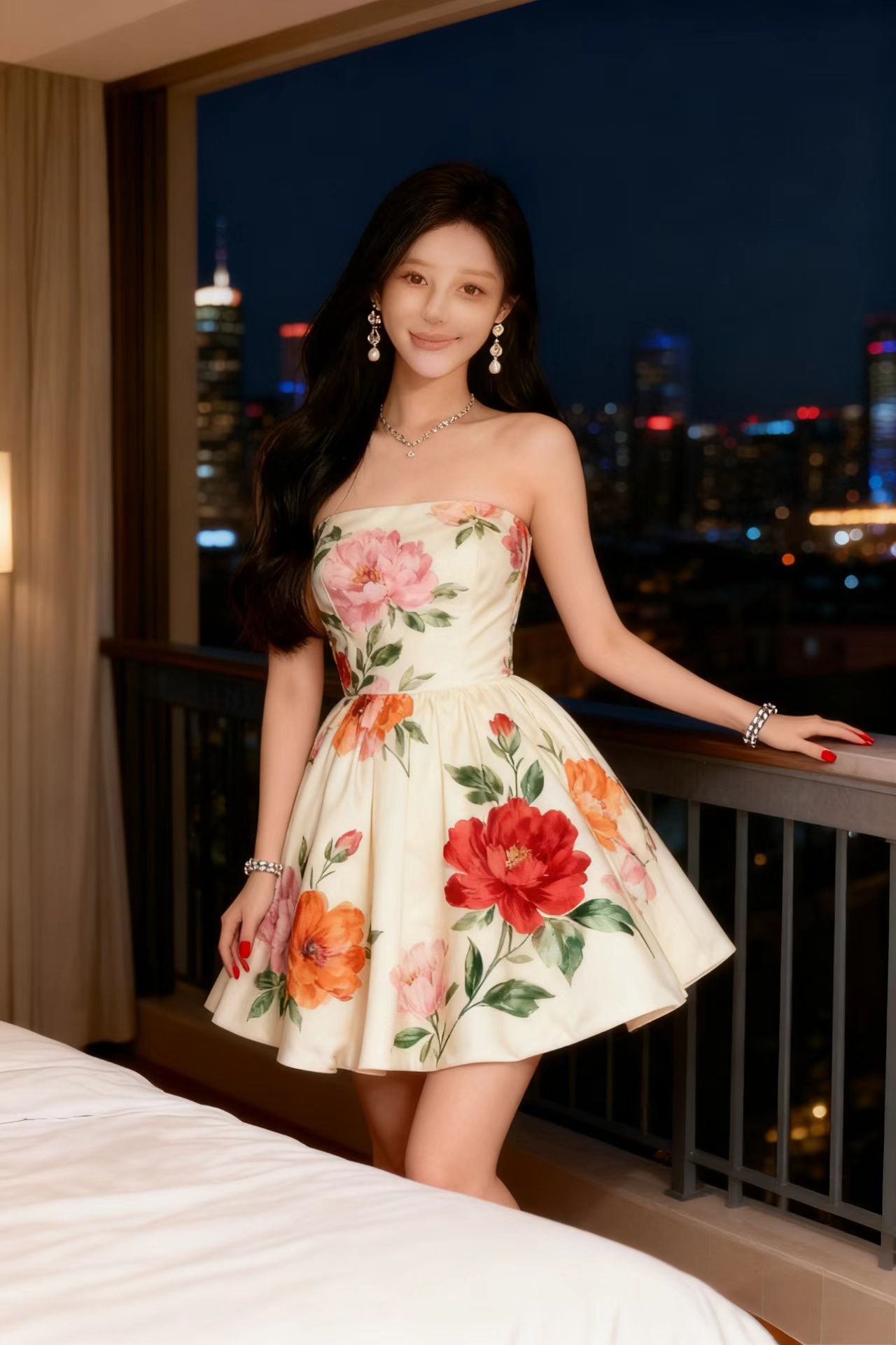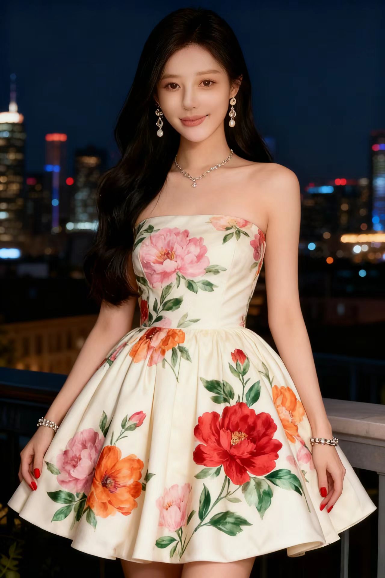 她身着一袭抹胸式短款连衣裙,裙身以米白色为底色,上面点缀着大朵的彩色花卉图案,包括粉色、红色、橙色的花朵,搭配绿色的枝叶,色彩明艳且富有层次感。