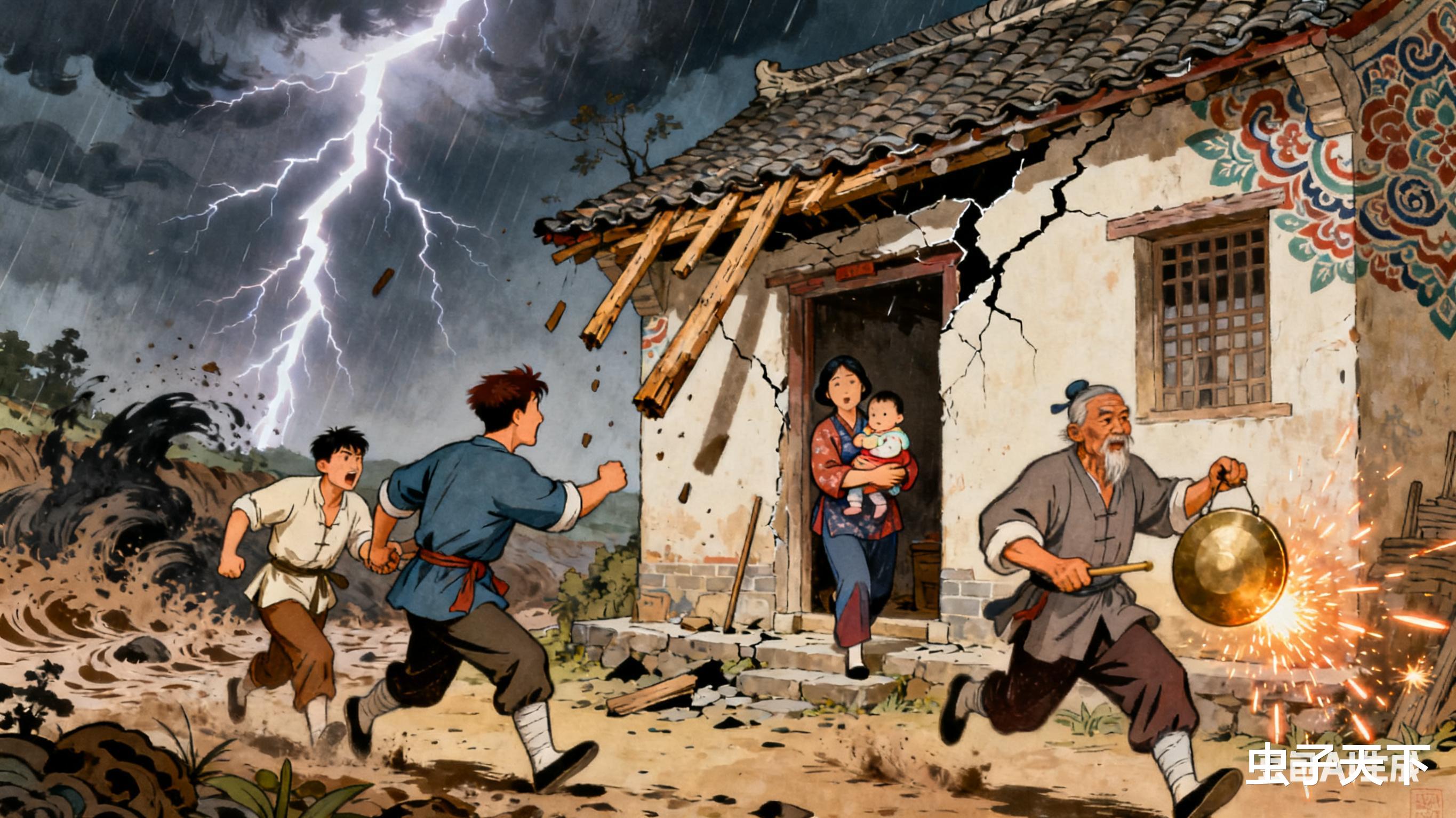 张铁匠家的新瓦房"咔嚓"裂开道缝,他媳妇正抱着娃往外跑,突然被飞来的房梁砸中……