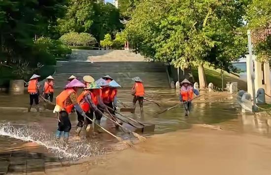 正午12点,南宁的天空湛蓝如洗,艳阳高照,气温飙升至33摄氏度。在这样的高温下,滨江公园里的环卫工人们依然坚守在岗位上,他们手持水管,认真地冲洗着每一寸被淤泥覆盖的土地。