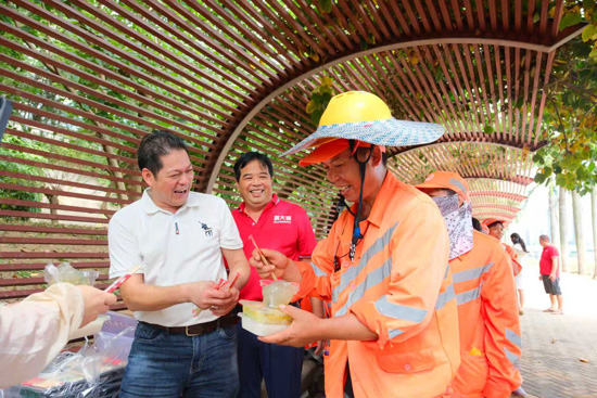 数百份竹盐鸡,搭配着莫氏香芋扣肉排骨,还有清爽可口的紫菜蛋花汤、解渴的矿泉水以及各式各样的饮料,每人一份,环卫工人们吃得津津有味,脸上洋溢着满足与幸福的笑容!