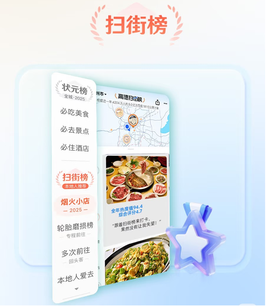 2025年9月10日,高德地图正式推出"高德扫街榜"。这个被称为“全球首个基于用户行为产生的榜单”的产品,承诺“永不商业化”,试图用真实导航、到店行为和AI技术重塑线下服务信用体系。