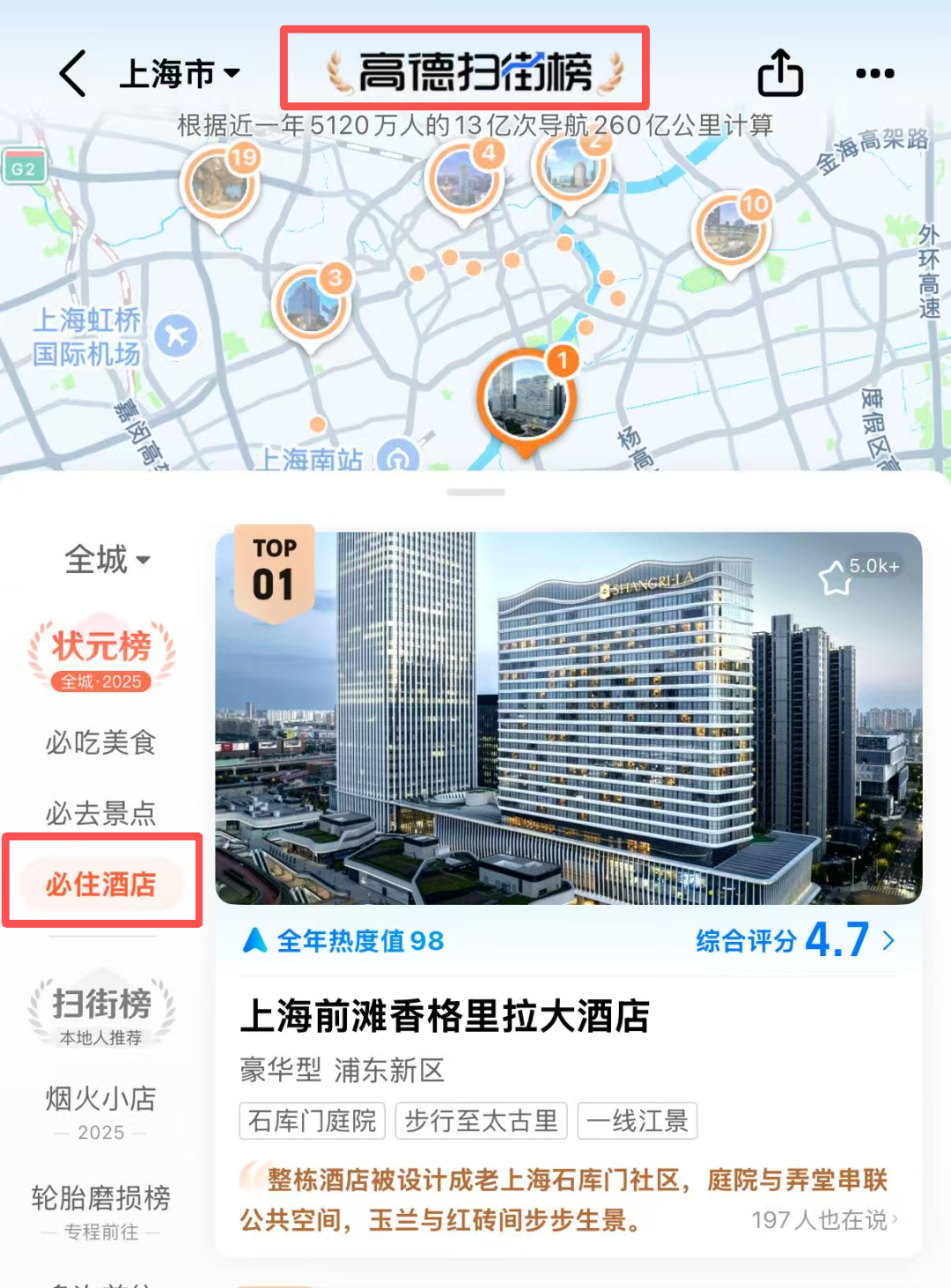而对于消费者来说,“高德扫街榜”意味着一个“省心”时代的开始:计划一次旅行,不用在各大平台的好、差评之间反复横跳;周末想找个酒店“Staycation”一下,高德“状元榜”上top的酒店大概率不会让你失望;甚至当你导航去一个陌生城市,系统基于实时行为数据推荐的“附近好评酒店”,能立刻解决你的选择困难症。