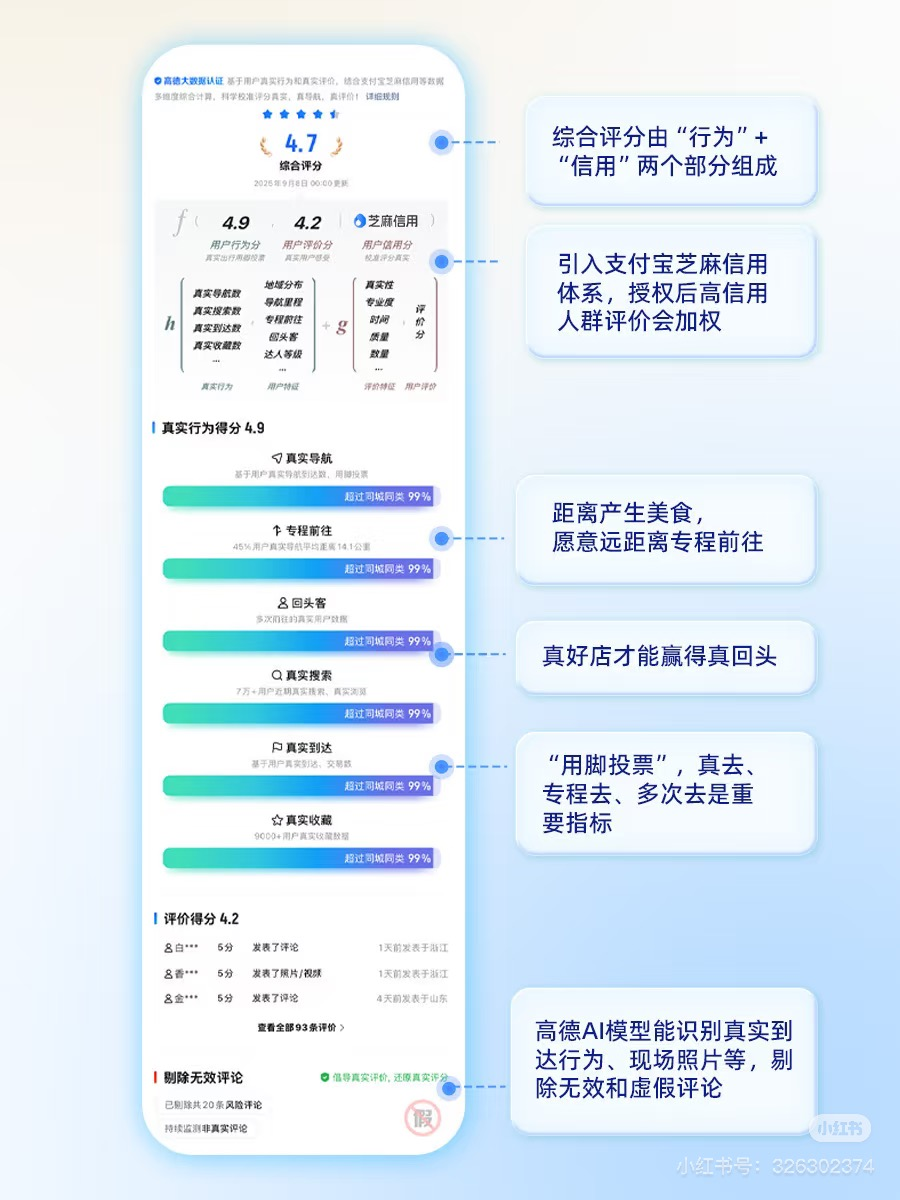 高德看到了消费者的痛点,此扫街榜完全基于真实用户行为数据。好评可以“刷”的,导航次数、实际到店率等硬指标,要"刷"成本可太高了。