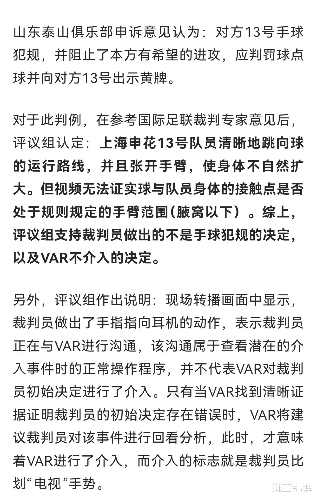 一场中超比赛的争议判罚,在足协与国际足联的来回回应中彻底沦为罗生门。当山东泰山对阵上海申花的比赛落幕12天后,中国足协以“参考国际足联专家意见”为由,驳回了泰山的申诉,认定马纳法的挡球不构成手球犯规。可这份看似盖棺定论的结论,非但没平息质疑,反而因“视频无法证实接触点”的表述,将争议推向了新的高潮。