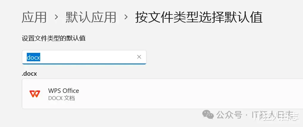 翻到下面,点击“按文件类型选择默认值”,直接输入docx,显示默认程序是WPS,图标和名称都显示正常,确定是关联正确的。