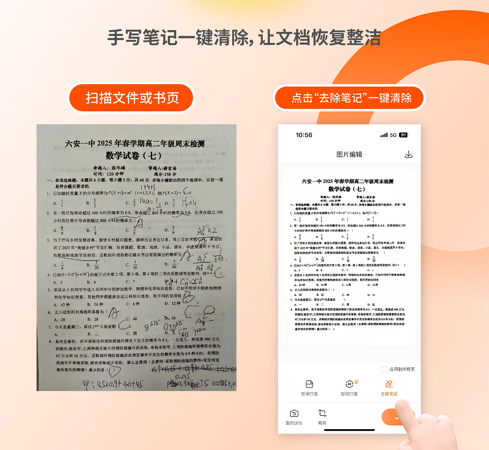 ●功能亮点:只需一键操作,便能快速去除文档中的手写痕迹,还原干净整洁的文档内容,无论是扫描试卷等学习资料,还是错题去除笔迹多次练习,都可以轻松做到。