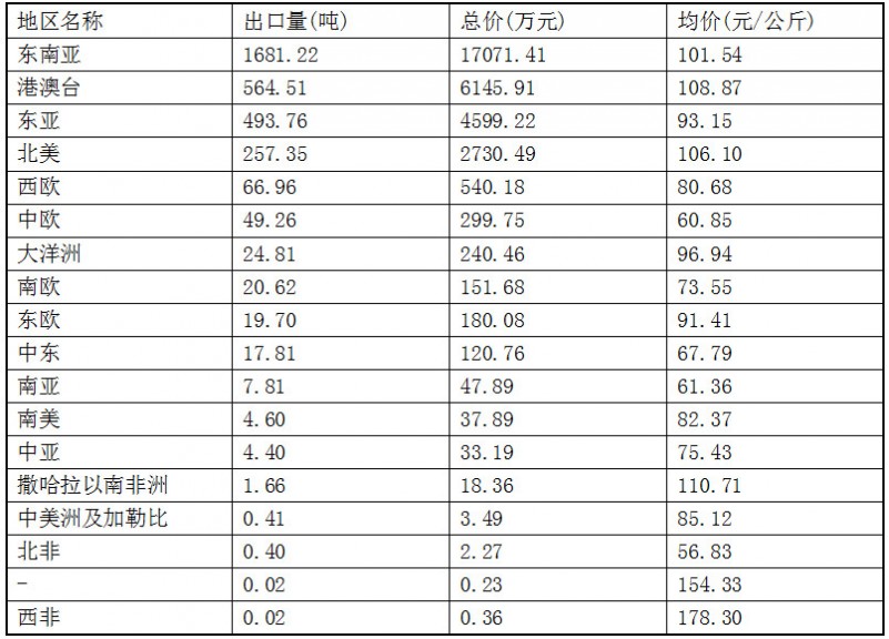 2025年6月我国干香菇出口目的地主要为东南亚、港澳台、东亚、北美、西欧等地区。出口情况如下表所示:
