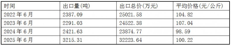 2025年6月干香菇出口总量3215.31吨,同比去年同期2421.63吨上涨793.68吨,涨幅32.77%。出口总价32223.64万元,同比去年同期23874.77万元上涨8348.87万元,涨幅34.97%。6月干香菇平均价格100.22元/公斤,同比去年同期98.59元/公斤上涨1.63元/公斤,涨幅1.65%。多年出口情况对比如下表所示: