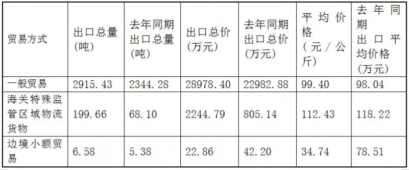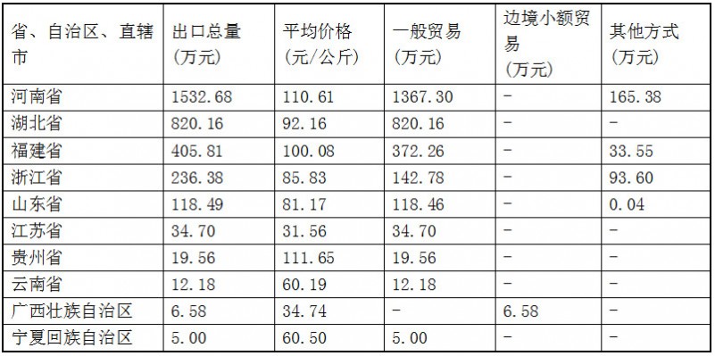 2025年6月干香菇一般贸易出口量2915.43吨,出口总价28978.40万元,平均单价为99.40元/公斤。海关特殊监管区域物流货物出口量199.66吨,出口总价2244.79万元,平均单价为112.43元/公斤。边境小额贸易出口量6.58吨,出口总价22.86万元,平均单价为34.74元/公斤。如下表所示: