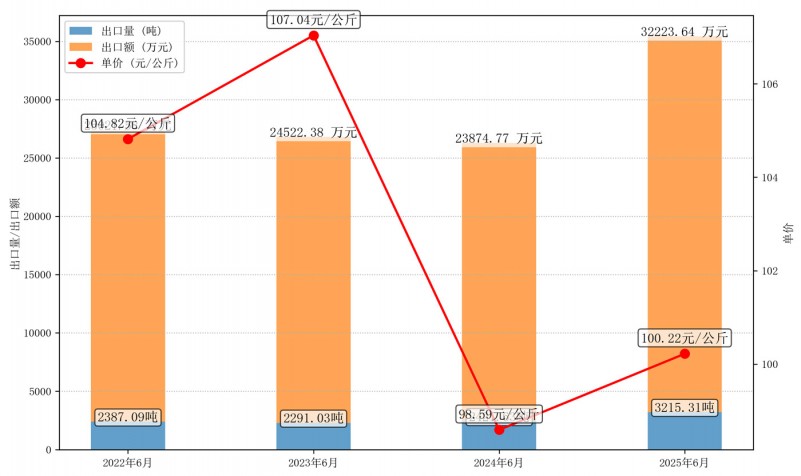 图1 2020-2025年6月干香菇出口数量/金额/单价对比图
