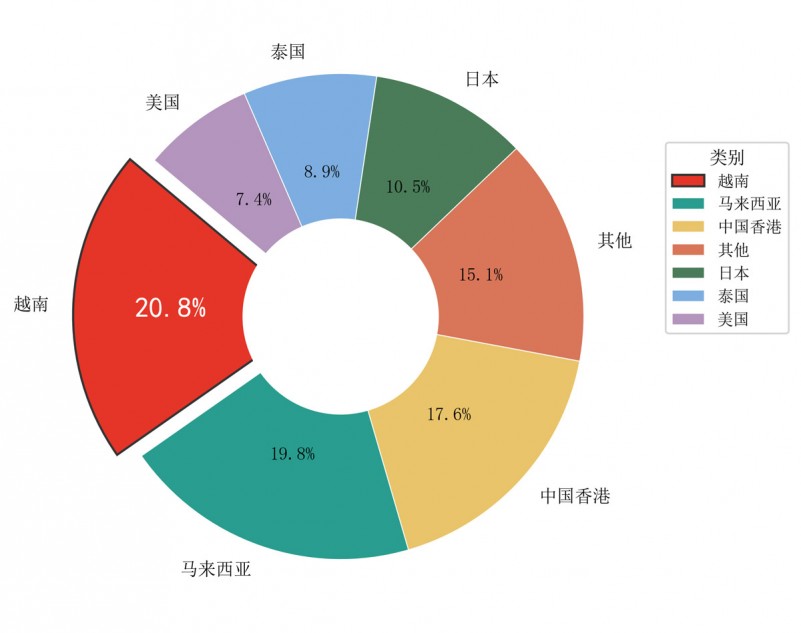 其中进口量前三的国家和地区为:越南进口量669.92吨,占总量的20.84%、马来西亚进口量635.90吨,占总量的19.78%、中国香港进口量564.51吨,占总量的17.56%如下图所示: