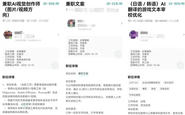 和以上两种路线相比,这一类副业最大的优点是更规范、供需链条更完善:上游对接着专业的公关、广告代理企业或MCN机构,需求相对稳定。不过这些岗位的待遇和“暴富”关系不大,许多AI写作类岗位单篇付费20-50元左右,AI方案、AI视频等也不过100-200元/次。