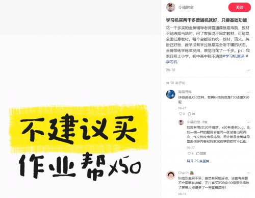 至于作业帮学习机用以吸引用户的“金牌辅导老师”,在小红书用户“令福的宠”看来,根本没必要买。