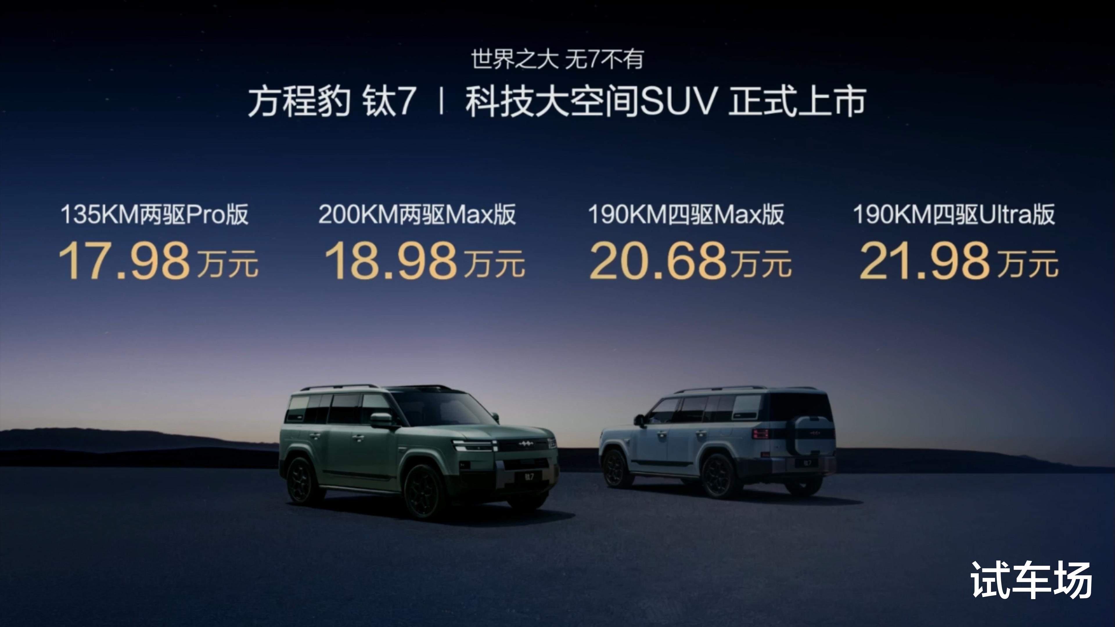 9月9日,方程豹旗下科技大空间SUV钛7迎来正式上市,新车共推出包括135KM两驱Pro、200KM两驱MAX、190KM四驱Max、190KM四驱Ultra版本共计四款车型,官方指导售价从17.98万元到21.98万元。如此价格单单对应其近5米的车身长度、2米的车宽,就已经是物超所值了,更何况它还应用了比亚迪的诸多黑科技。下面就为大家介绍一下这台十几万的车型,性价比究竟高在了哪里。
