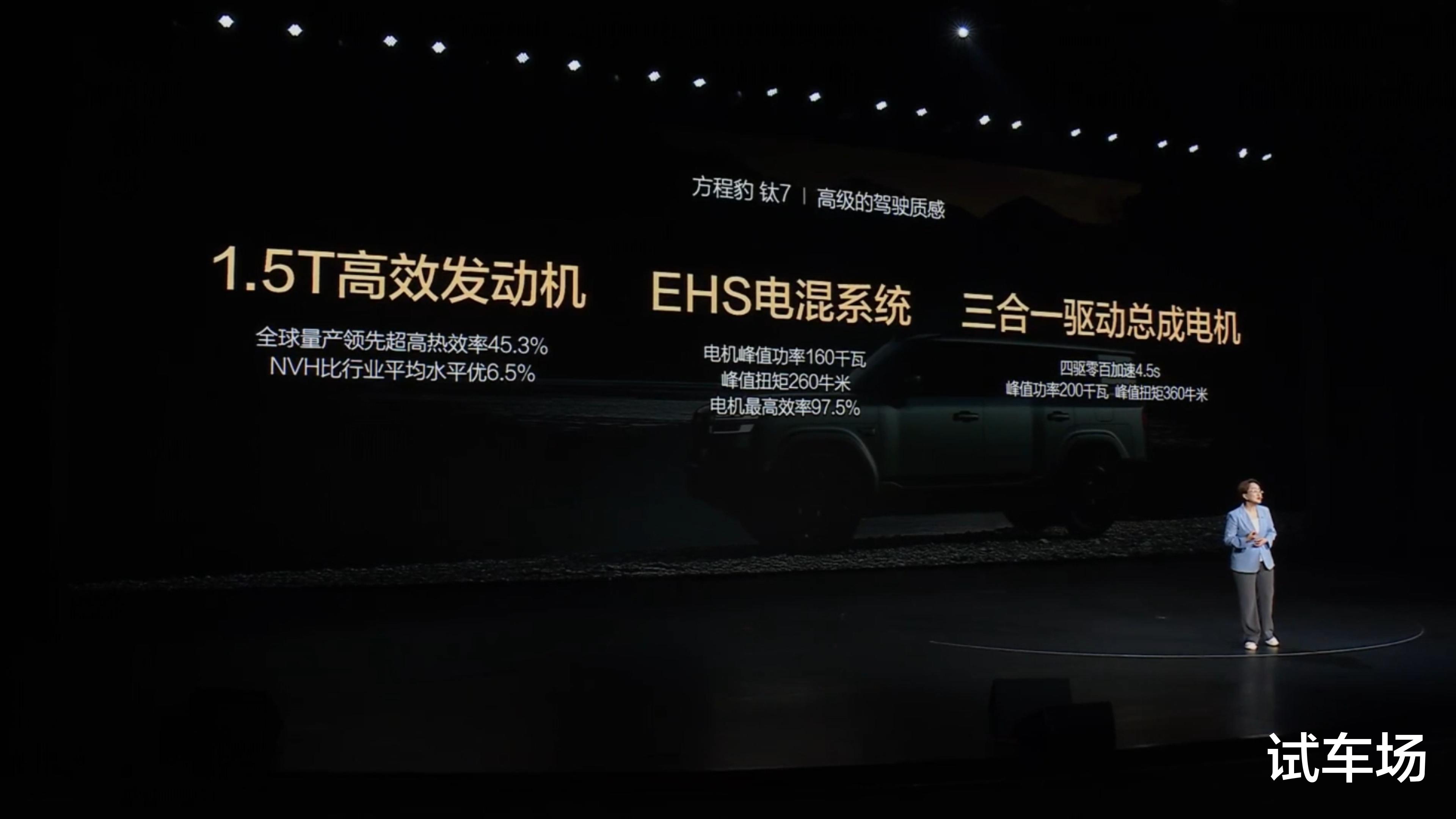 动力方面,方程豹钛7基于比亚迪新一代DM平台打造,搭载最新一代26.6kWh和35.6kWh的插混专用刀片电池与1.5T高效发动机、EHS电混系统、三合一驱动总成电机组成插电式混合动力系统。拥有多种驱动模式灵活组合,可实现10种驱动模式切换,让车辆始终保持最优能耗和最佳动力。四驱零百加速可达4.5s,最高车速可达190km/h,纯电续航最大200km,最大综合续航1300km完全没有里程焦虑。