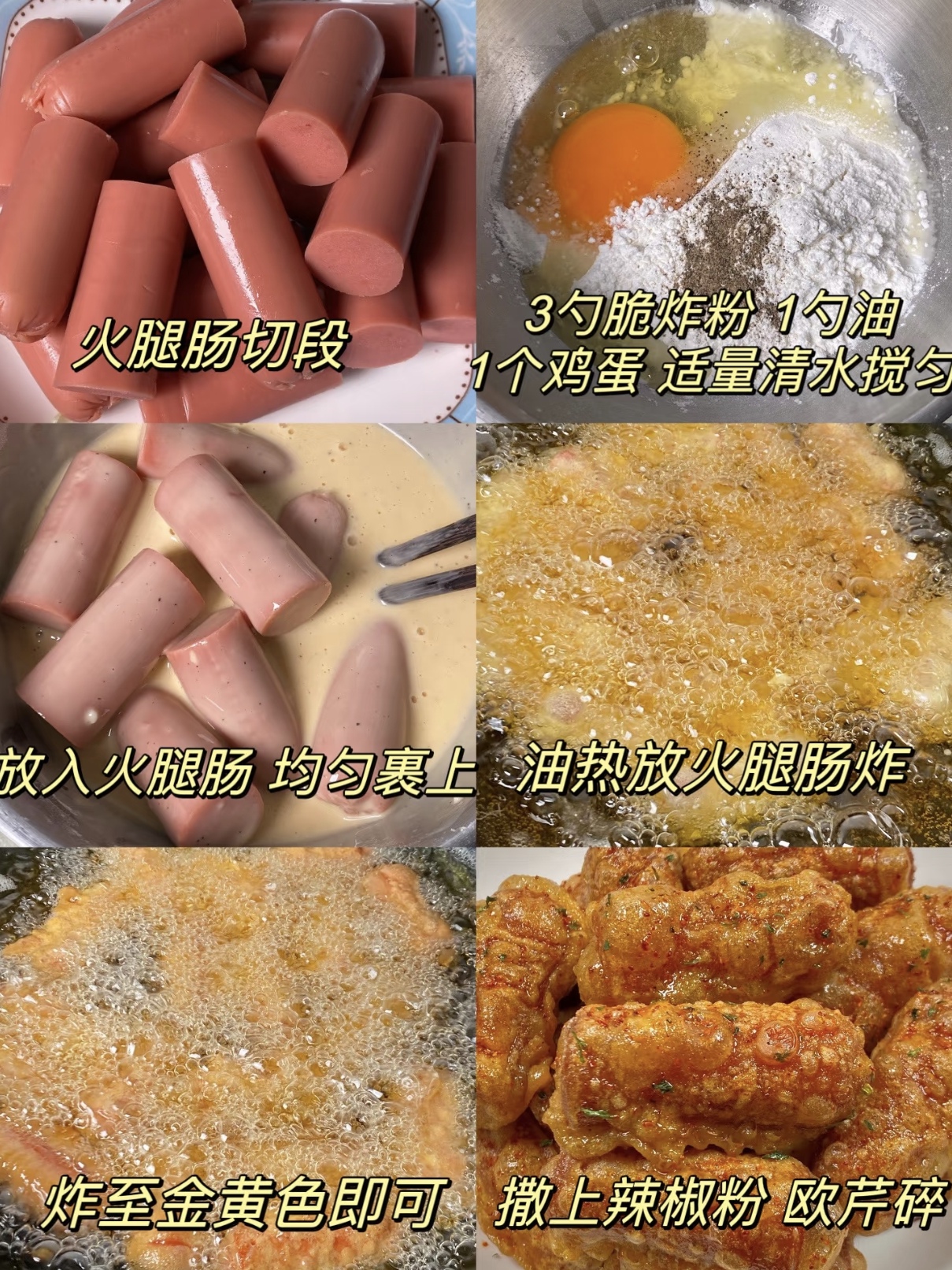 还记得放学后那个冒着热气的小摊吗?铁板上滋滋作响的火腿肠,裹着金黄酥脆的外衣,刷上鲜亮的酱料,那味道简直能瞬间点亮整个黄昏。如今虽已长大,但对那口酥香脆嫩的渴望却从未消失。今天,就让我们在家复刻这道“校门口顶流”美食,不仅简单快手,还能吃出满满的情怀!这次我们换个豪迈的吃法——不切花刀,直接切段,让酥脆裹粉的面积最大化!
