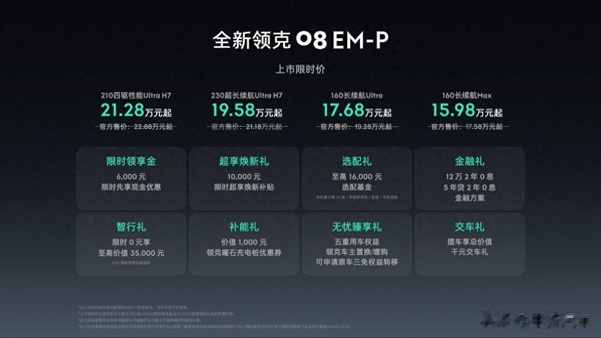 9月24日,“家庭豪华智混SUV”全新领克08 EM-P正式上市。新车提供160长续航Max、160长续航Ultra、230超长续航Ultra H7、210四驱性能Ultra H7四款车型可选,官方限时价15.98万元-21.28万元。同时,伴随新车上市还有限时领享金、超享焕新礼、选配礼、金融礼、智行礼、补能礼、无忧臻享礼、交车礼在内的8重限时福利。