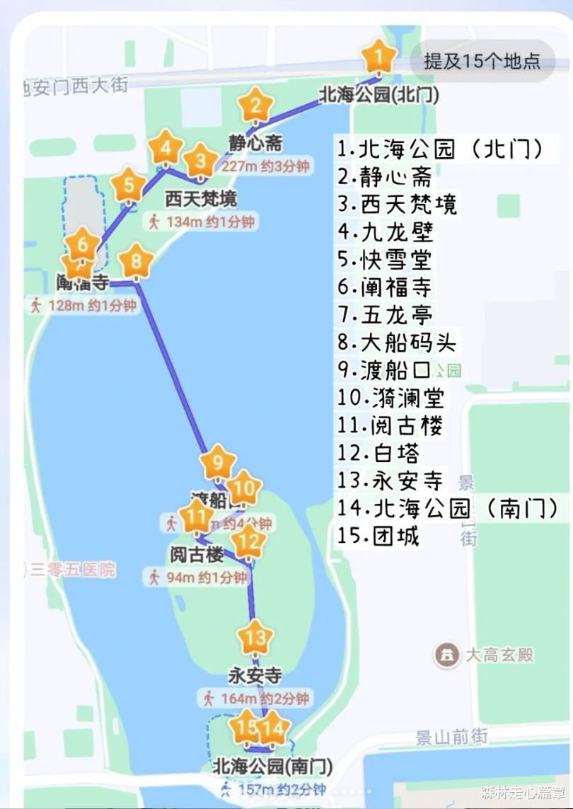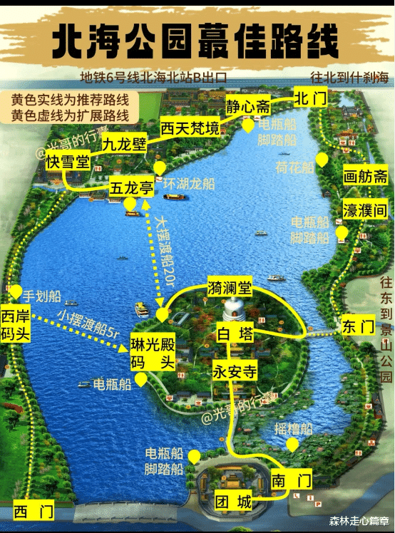 4、公园很大,有很多类型的游船,有好几个门,最推荐北门哦,离地铁站近,进来就是很漂亮的园林“静心斋”,公园景点挺多的,体力不好想要快速逛完精华景点,或者带年纪大的父母游玩的,可参考以下路线,亲测景美省力,且不废脚。【推荐路线】北门进北门出!路线在【北门入园️静心斋➡西天梵境➡九龙壁➡快雪堂➡五龙亭➡️万佛楼遗址&石碑➡西岸码头乘摆渡船(5元)琳光殿码头➡白塔和永安寺➡东门(不出园)➡濠濮间➡画舫斋➡北门出园➡什刹海