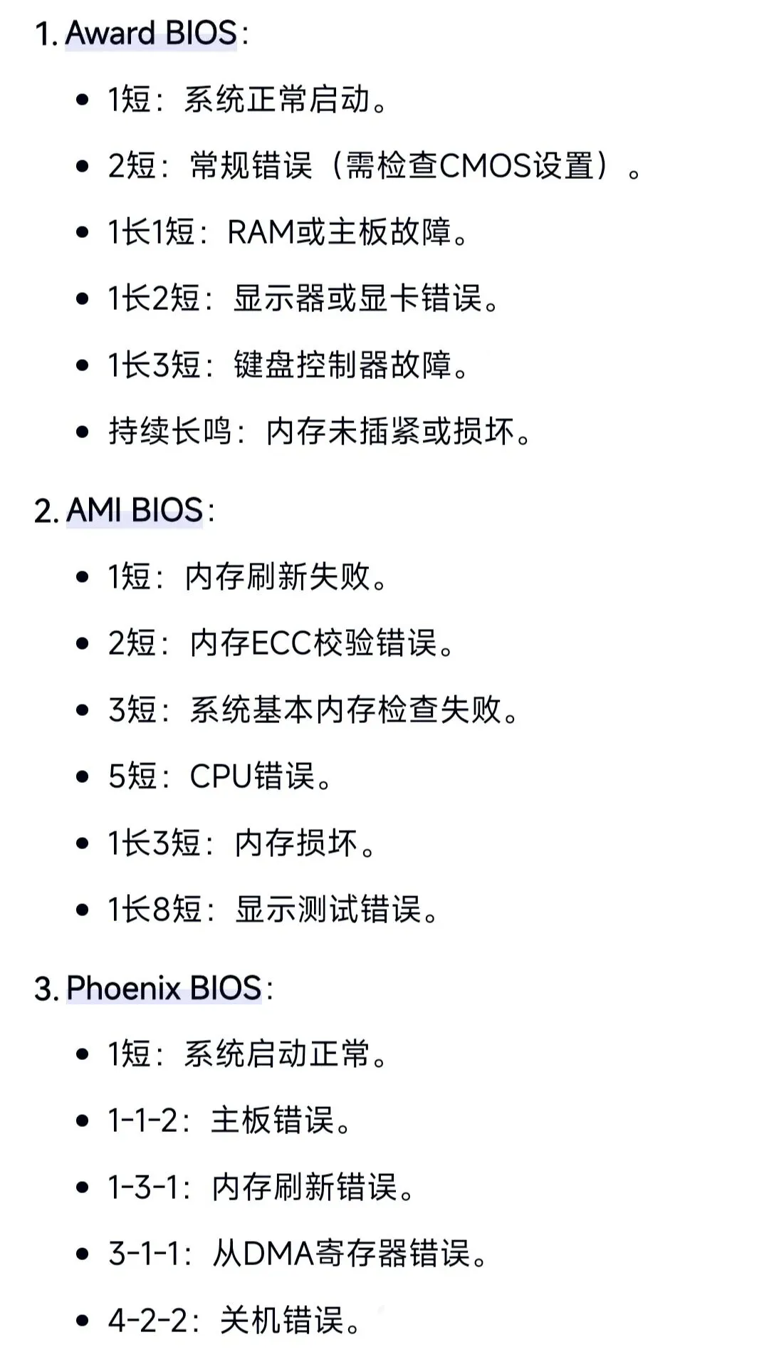 对于蜂鸣器的每种提示音对应的故障,我就不详细分析了,直接上一张图,毕竟现在市面上带蜂鸣器的电脑不多,很多人都不一定用得上。