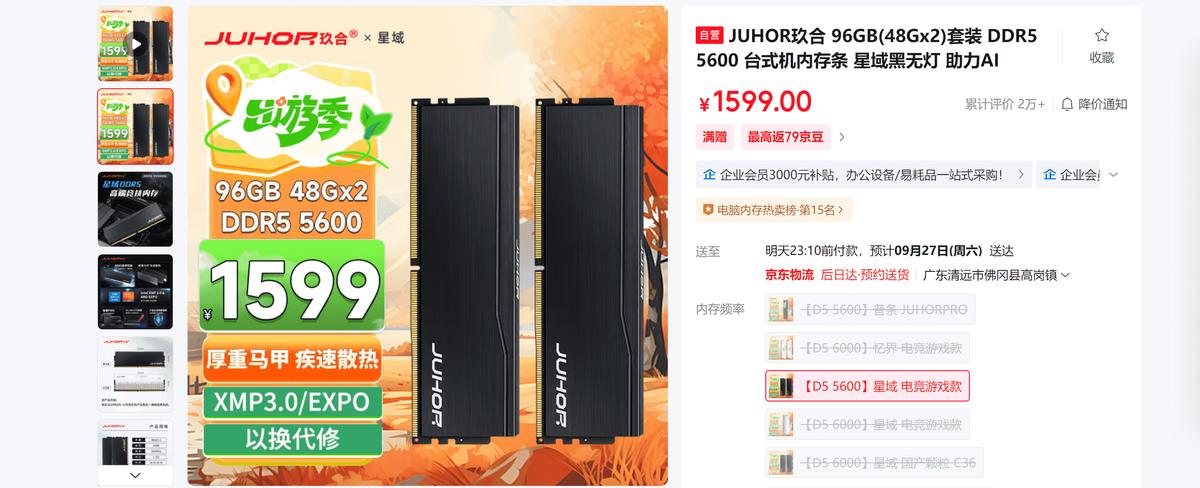 玖合星域 DDR5 5600MHz 96GB(48GB×2)套装——1500元级的“生产力巨无霸”推荐搭配平台:AMD 锐龙9000系、7000系平台;英特尔Ultra系列,14代系列的创作平台均可上车!京东验证
