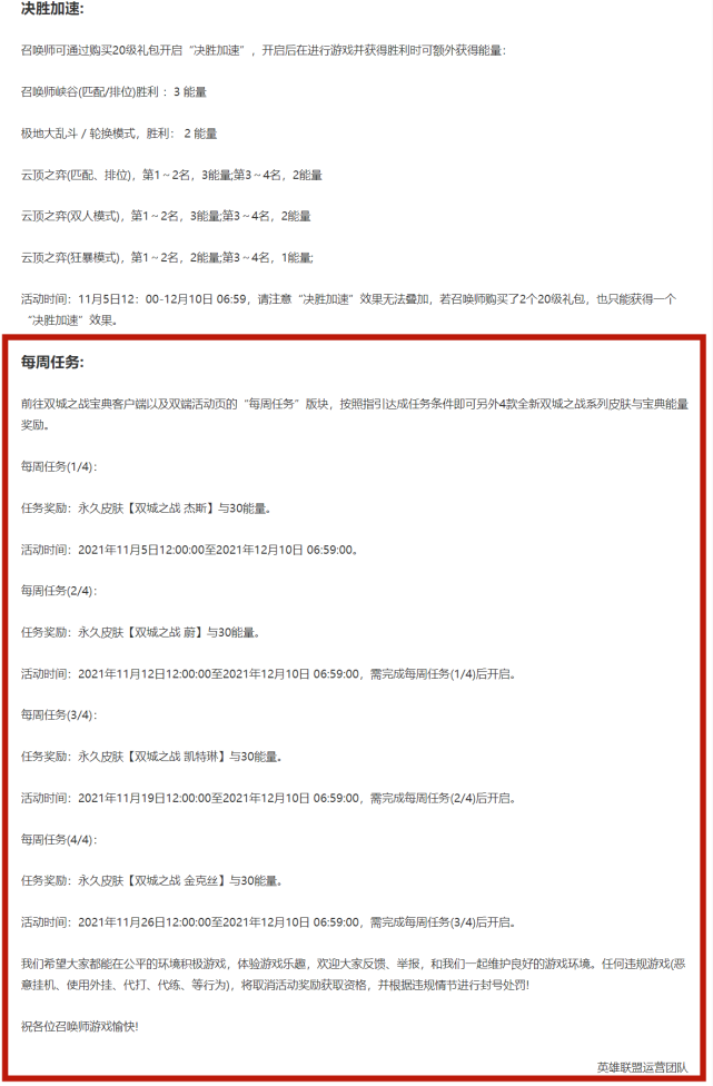 除了宝典之外,本次最大的惊喜莫过于4款免费的皮肤。没错,只要各位玩家有时间玩游戏,到时候只要在线上完成了对应的任务,就可以获得4款双城之战的英雄皮肤。