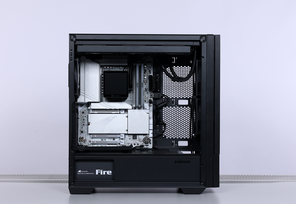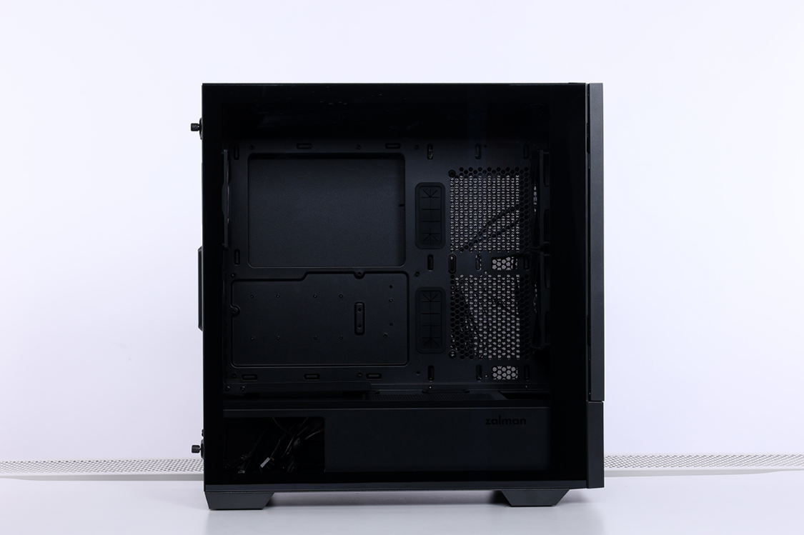 机箱内部空间宽敞,最大支持安装ATX主板,显卡安装限长395mm。出厂预装了一块三槽位显卡竖装支架,玩家无需额外购买转接支架即可实现显卡竖装。散热系统方面,风冷安装限高173mm,支持顶置、前置安装360规格水冷,包括机箱出厂预装的3把120mm规格风扇在内,整个机箱最多可同时安装11把120mm规格散热风扇(含电源仓上方位置)。