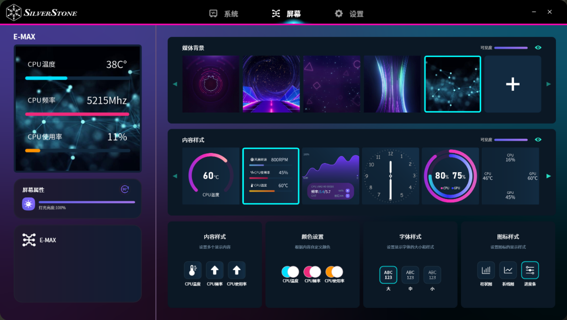 圆形冷头,顶部还预留了4颗用于和水冷屏幕连接的定位螺丝。水冷配件盒中提供了一块磁吸式方形水冷屏幕,屏幕尺寸为3.95英寸,分辨率为480*480,刷新率为30Hz,屏幕通过USB 2.0插针线与主板连接,搭配上水冷配备的控制软件,可以实时显示电脑硬件的信息,也可以在软件屏幕页面中,上传jpg、png、gif、mp4等图片或视频格式的背景文件,让玩家可以对水冷屏幕展示的内容进行自定义设置;