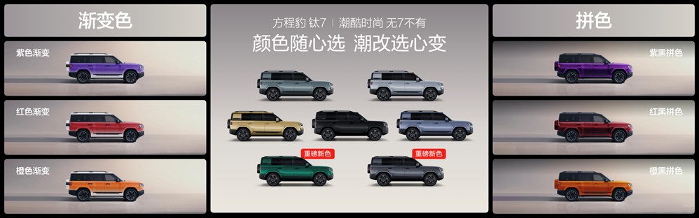 为了让广大用户选得尽兴,钛7直接一步到位,带来了7款外观颜色、3款内饰颜色,同步在官方商城上架了6款潮改方案,可满足不同用户的审美偏好。