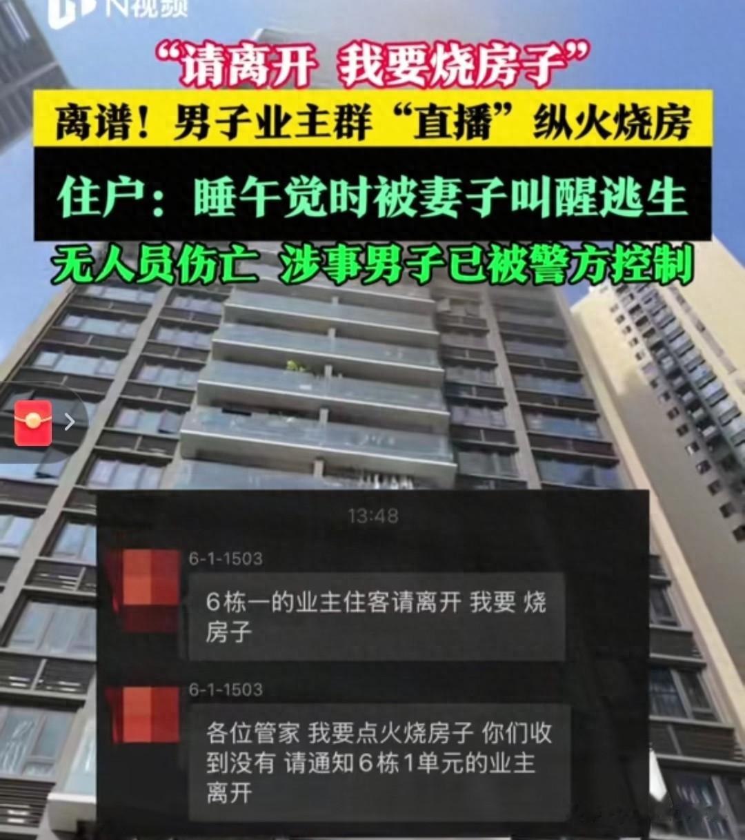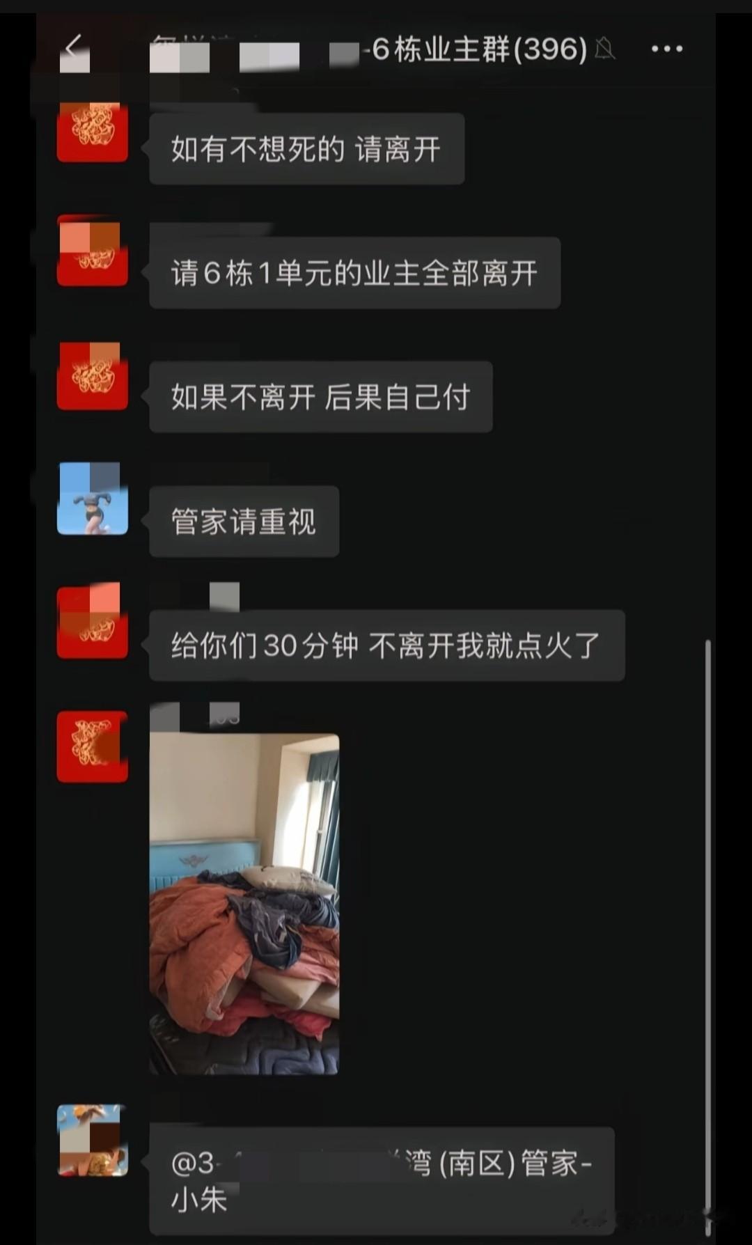 “请一单元业主全部离开,给你们30分钟,我要烧自己房子,不离开后果自负!”