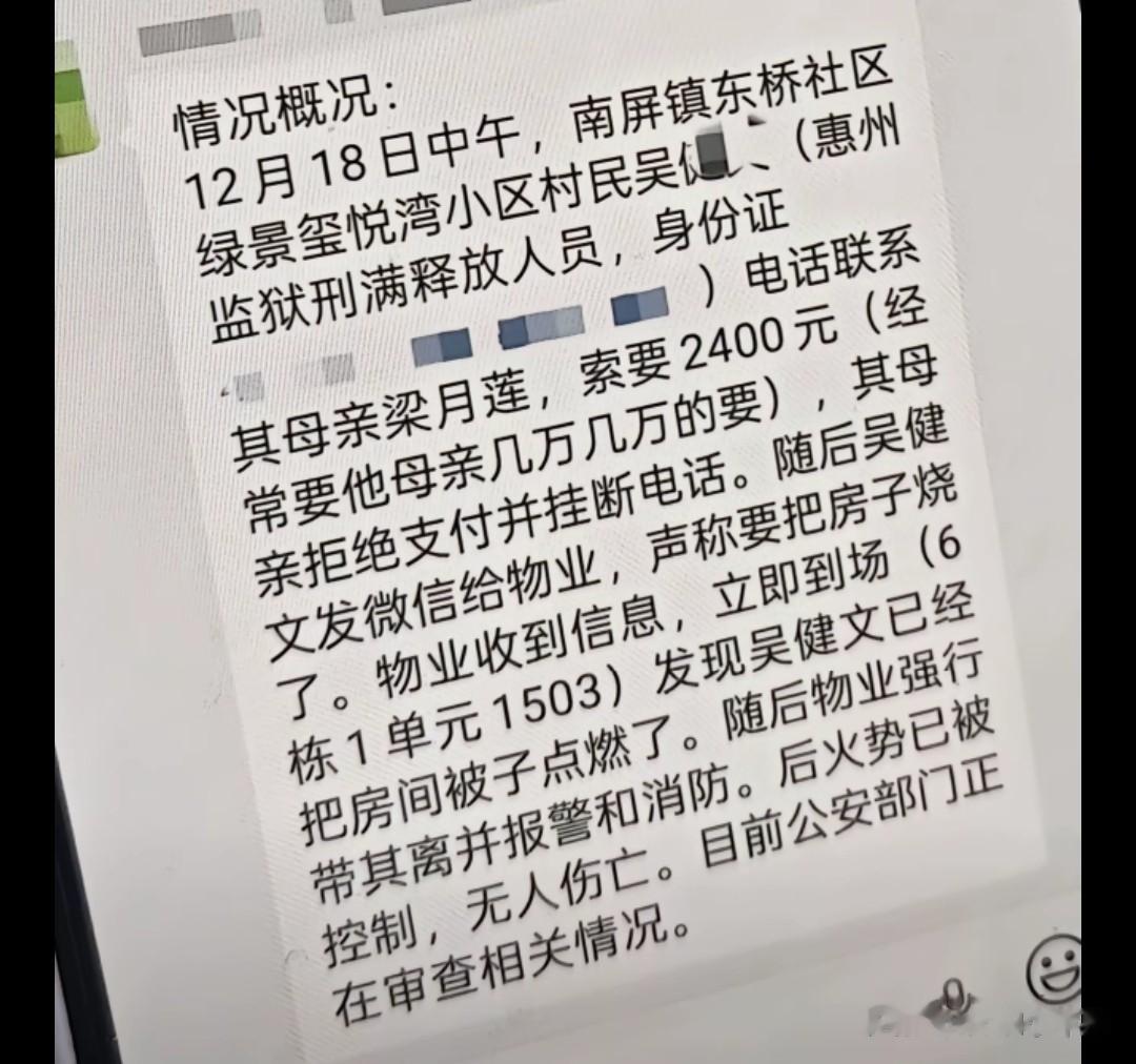 据网传消息透露,该男子疑似向自己妈妈要钱不成才恼怒纵火,且疑似有前科人员。