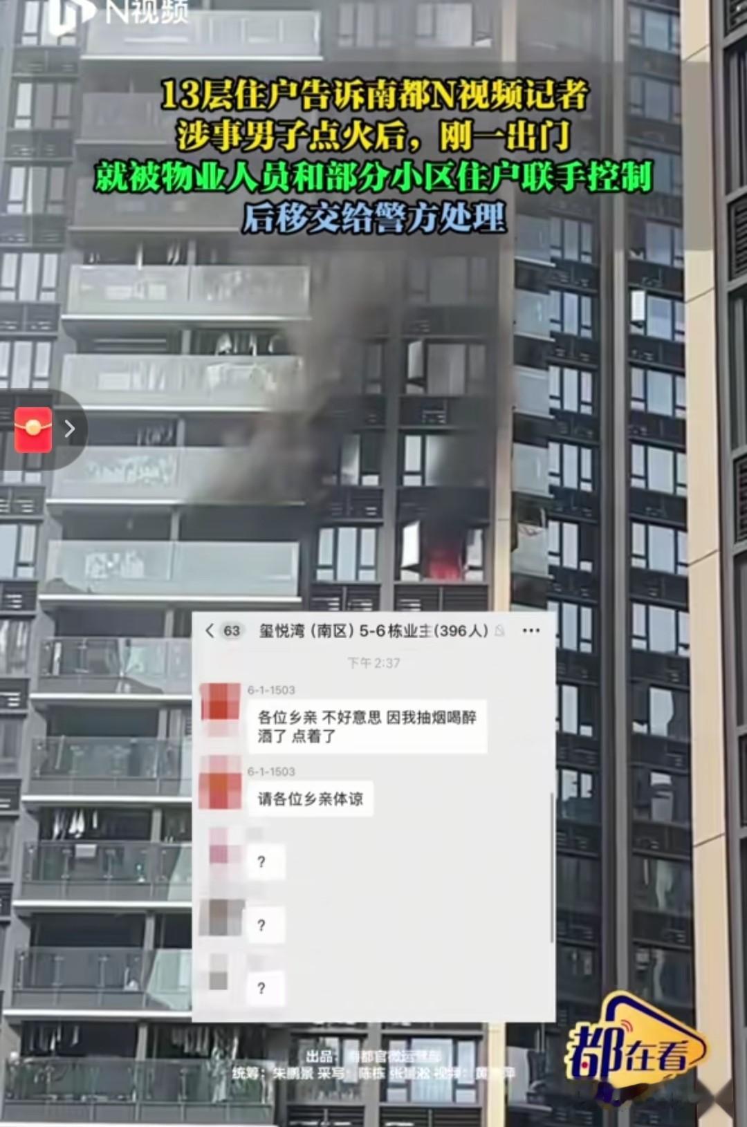 涉事纵火男子也当场被众邻居和物业控制扭送给帽子叔叔带走!事发后不久,该纵火男子又在业主群发声,这次不是放火而是道歉,为自己点火行为道歉,其解释称:是因为自己喝醉了,脑子进水了,想歪了,抽烟不小心点着了,希望大家见谅!