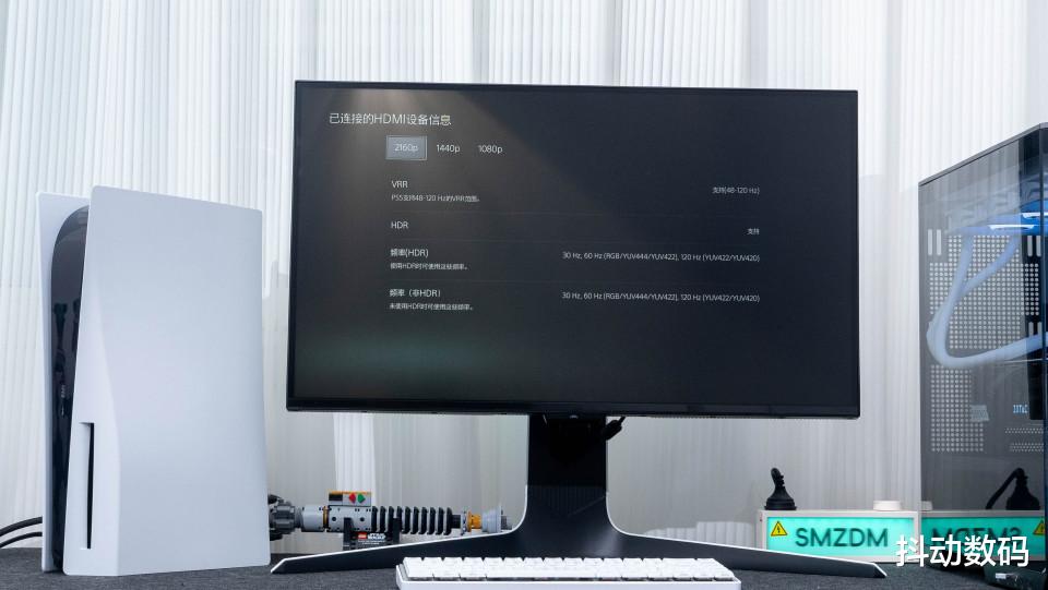 实测搭配PS5 游戏主机,可以在已连接的HDMI 设备信息中看到,雷鸟27U8 显示器支持4K 120Hz HDR 模式,还支持 ALLM 和 VRR 的 48-120Hz 自适应刷新率。