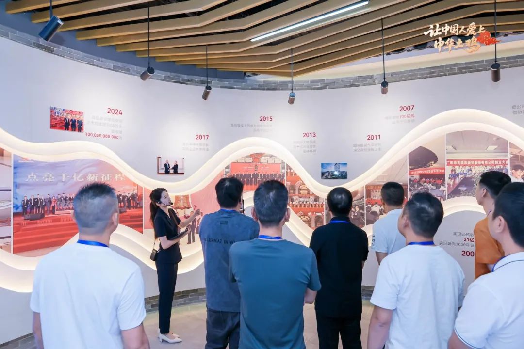 温氏企业展示馆采用简单大气,低调务实风格,由党建厅,缘起厅,全景厅、高质量发展厅、品牌传播厅、互动观影厅、赏味厅七个部分组成。在馆内,讲解员详细介绍了企业42年的发展历程。从1983年“七户八股”集资创办,到如今成长为年营收超千亿元的农业产业化国家重点龙头企业,温氏人一路奋斗向前,深耕行业,硕果累累。