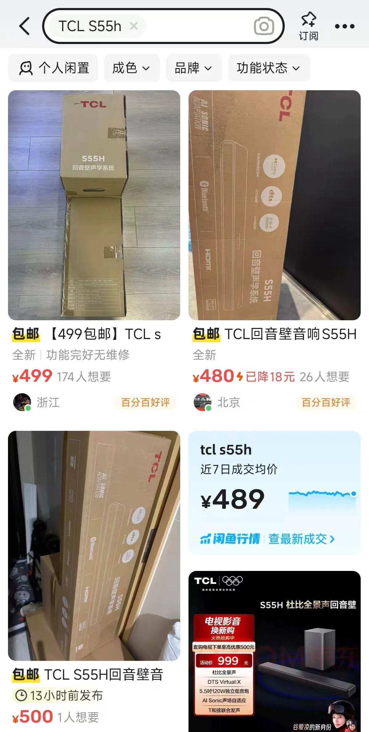 这是我在闲鱼查的价格,TCL S55H回音壁均价是490元左右。当然,不卖的话留着自用也挺好,不过85英寸电视自带的音箱也不差,就看自己耳朵挑不挑剔了。